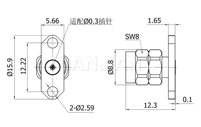 商品描述:1.85mm straight pin flange connector,90GHz